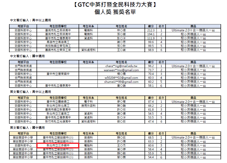 賀!本校705王聖杰參加GTC中英打暨全民科技力大賽榮獲國中英文看打輸入個人獎第3名!