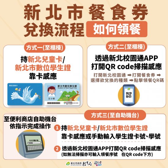 - 新北市幸福晨飽早餐券及弱勢學生午餐券兌換流程圖卡(含兌換流程說明影片QR code)