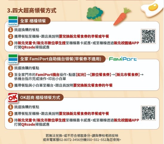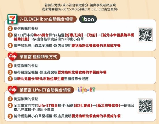 新北市幸福晨飽早餐券及弱勢學生午餐券兌換流程圖卡(含兌換流程說明影片QR code)