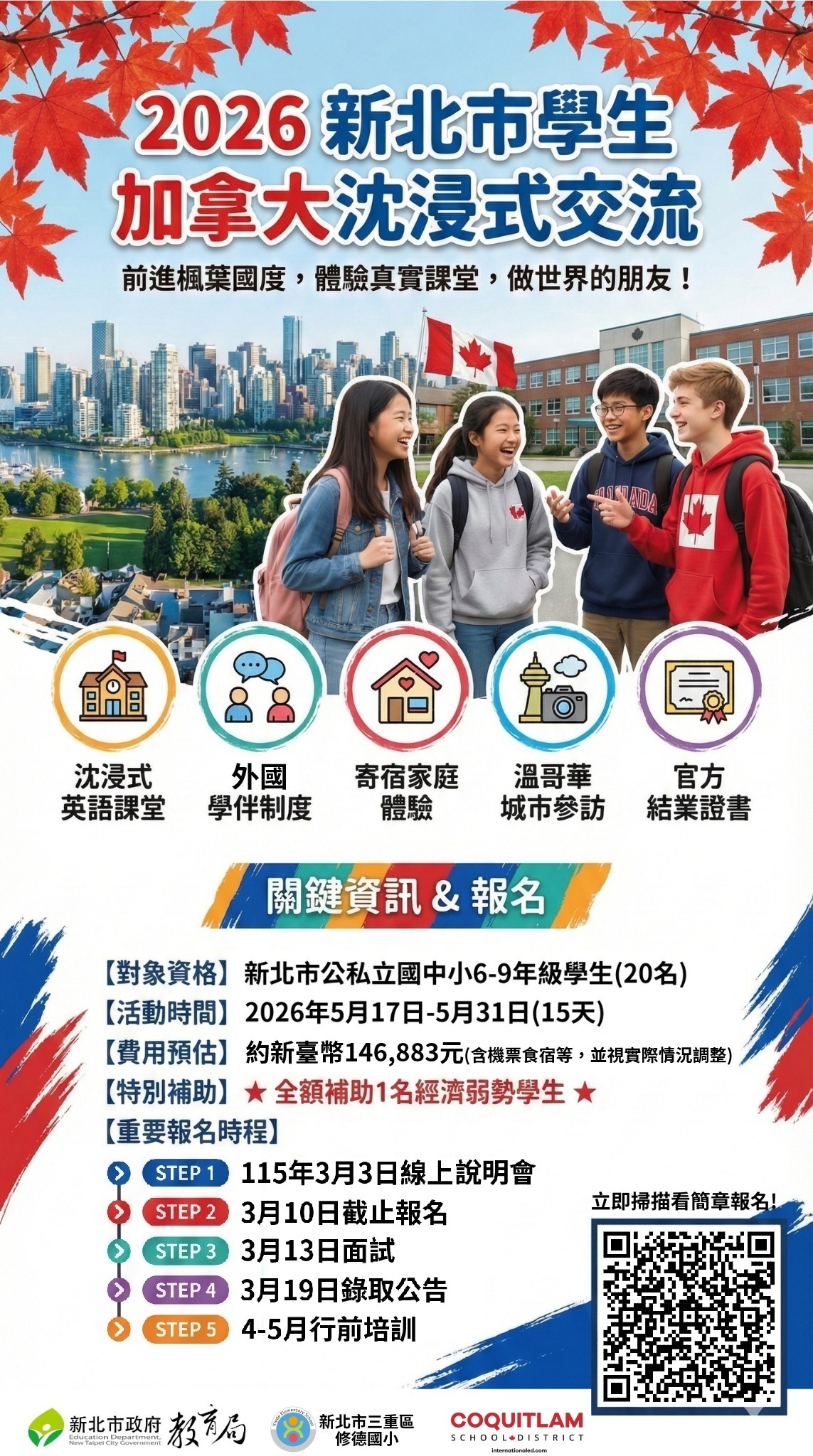六、檢附2026新北市學生赴加拿大高貴林學區沉浸式語言及文化交流計畫與DM(如附件)1份。