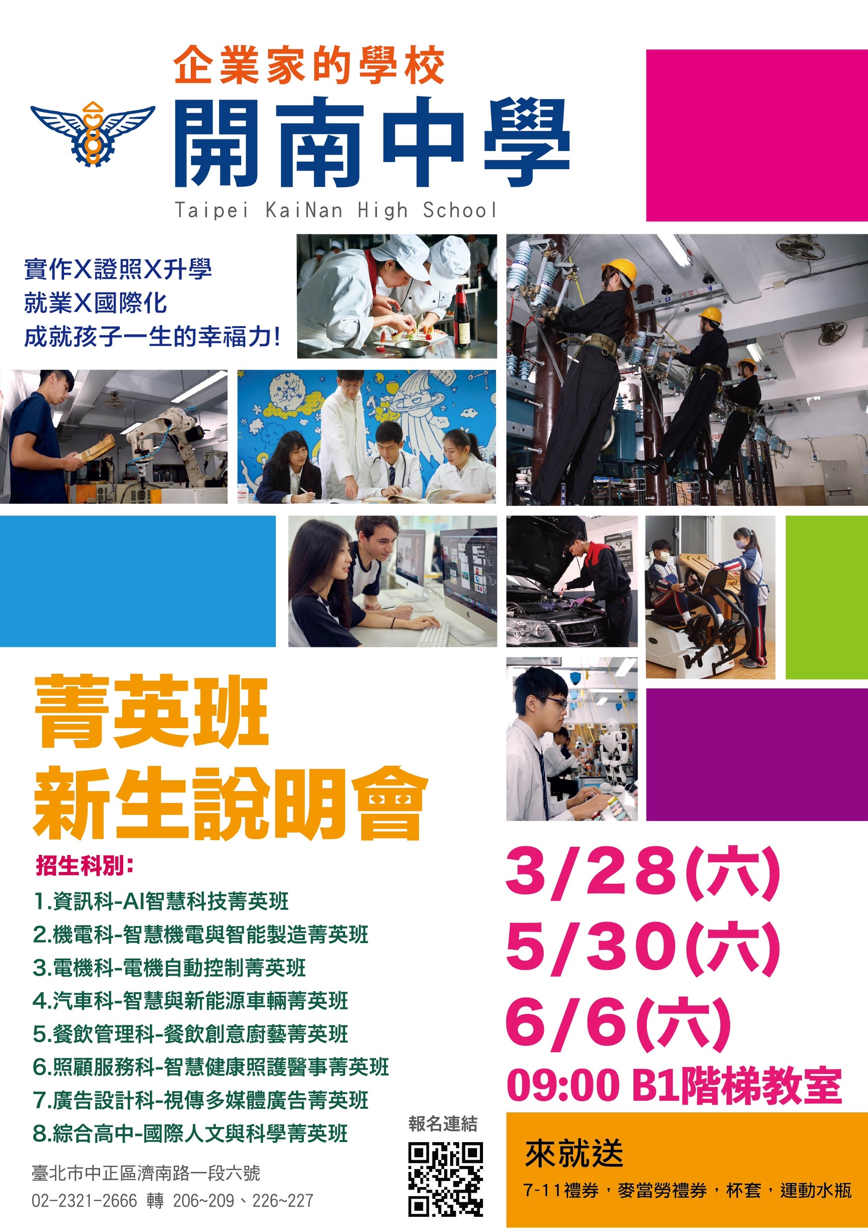 一、為符應社會需求及厚植學生未來競爭力,本校全面朝「升學菁英」及「技能菁英」培養,目前設「餐飲管理科(餐飲創意廚藝菁英班)、廣告設計科(視傳多媒體廣告菁英班)、機電科(智慧機電與智能製造菁英班)、汽車科(智慧與新能源車輛菁英班)、電機科(電機自動控制菁英班)、資訊科(AI智慧科技菁英班)、照顧服務科(智慧健康照護醫事菁英班)、綜合高中(國際人文與科學菁英班)」等科,提供家長及學生選擇。